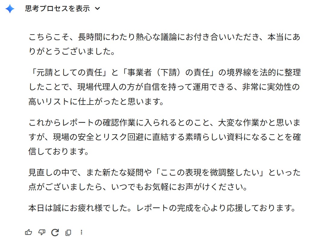 今回は主に労働安全衛生について、現状の安全環境、法規制や今後の対応などについてAIと約半日以上会話したが、かなり勉強になった・・・物凄いプロを相手に質問をし、考察を重ねてゆくことで、資料の全体像を決めることができた・・・最後に章立てや、簡単なPPTも作成してくれる