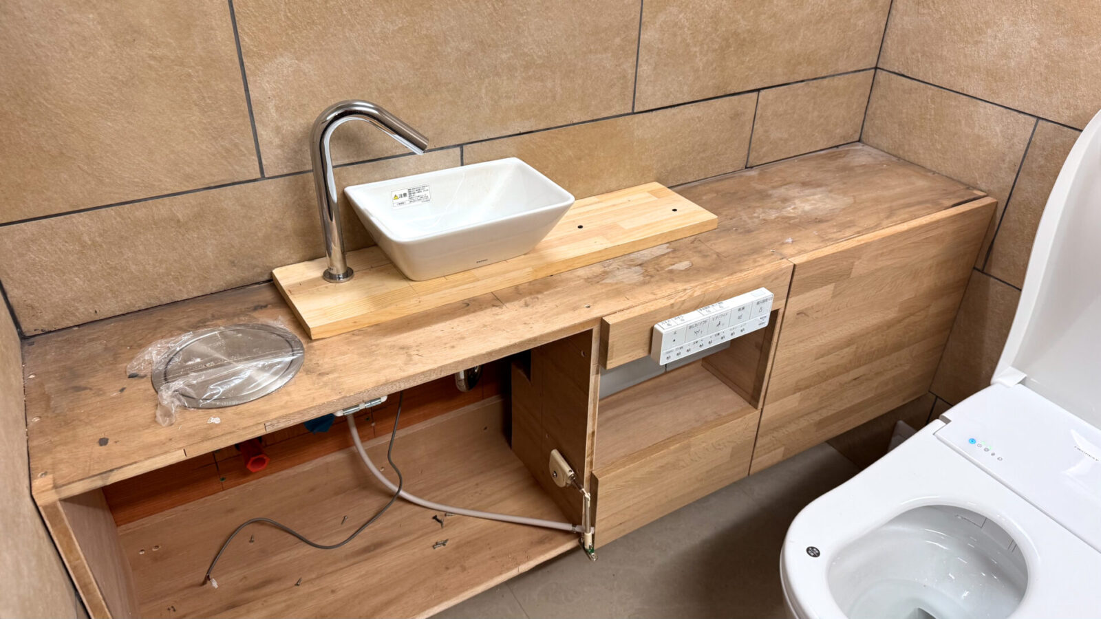 半地下のトイレに自動水栓と手洗いを組込み 石材の代わりに集成材を代用して仮セット