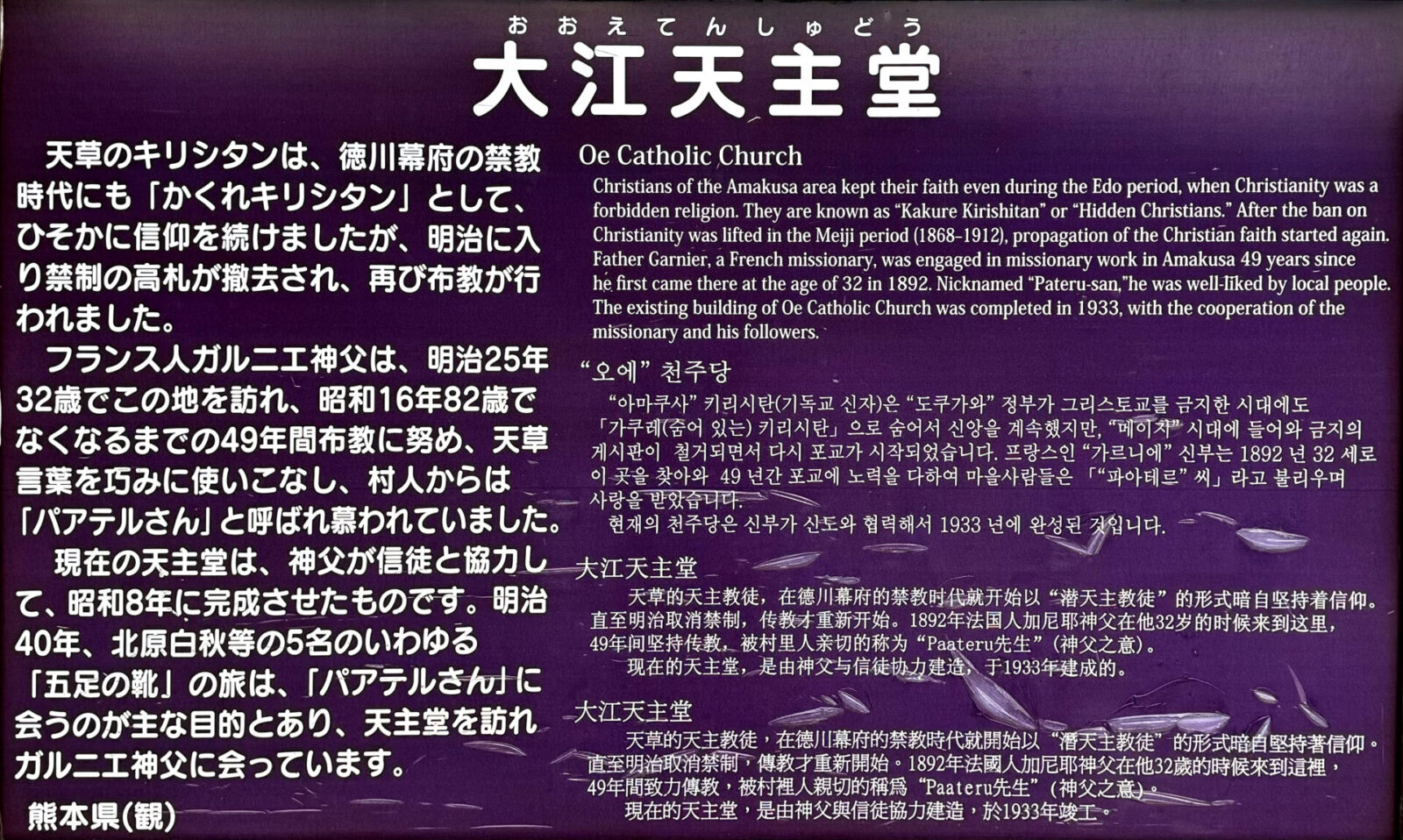 宿を7:30に朝食、8:20に出発、十三仏岬に寄って、林道を走りかなり山の上にある根引の子の部屋により、荒尾岳展望台、西平椿公園を経由して、大江天主堂に、途中で天草ロザリオ館に寄るが休館だった・・・今回は休館が多い
