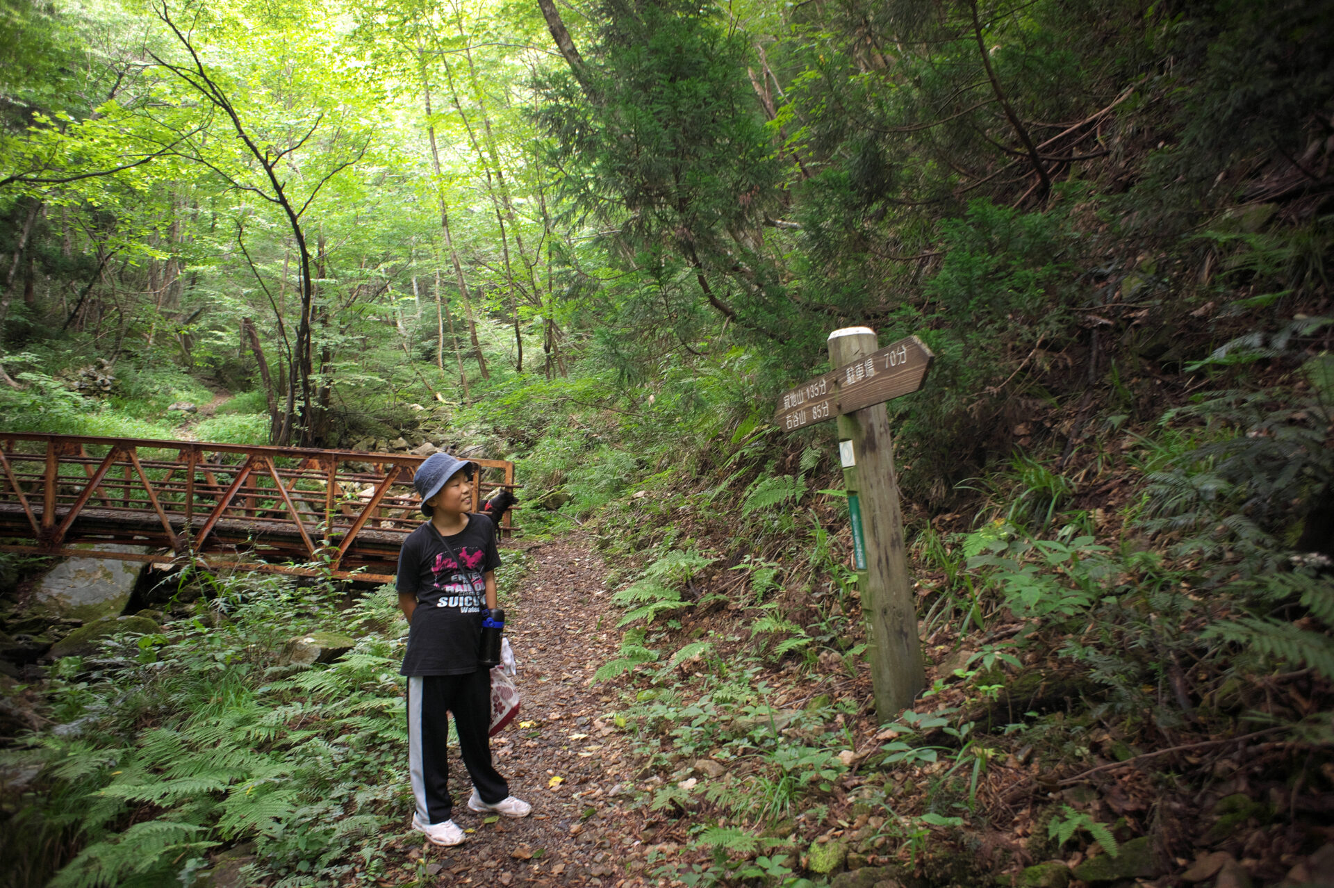 10:03 トンネルを抜け橋を渡り、左が寂地山へ190分、右は下る遊歩道