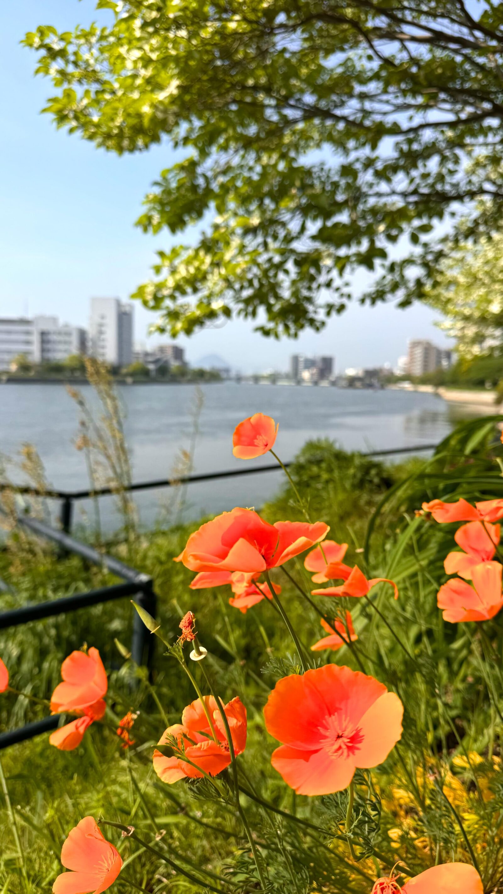 ポピーが護岸で鮮やかに 朝の帰途との散歩